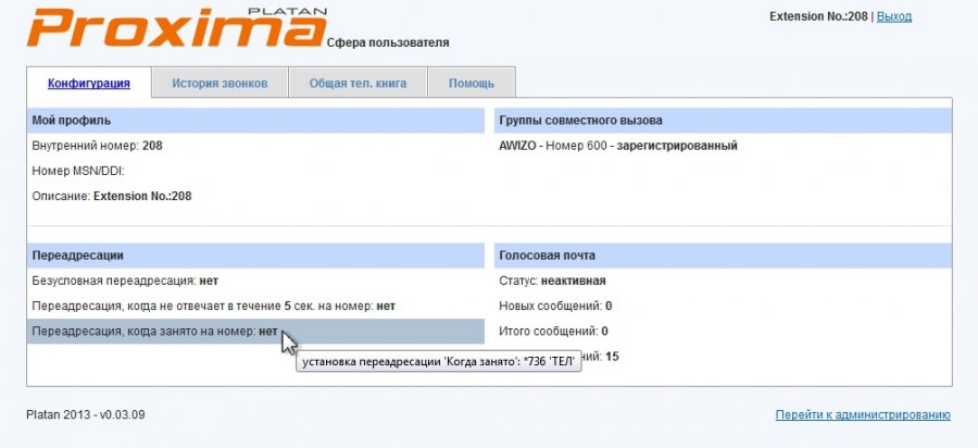 - в PBX Server Libra, IP PBX Serverze Proxima и IP PBX Server Proxima plus информация о статусе голосовой почты (активная/неактивная, количество сообщений – макс, новых, всех) видима для каждого пользователя в Сфере пользователя доступной в интернет поисковике,